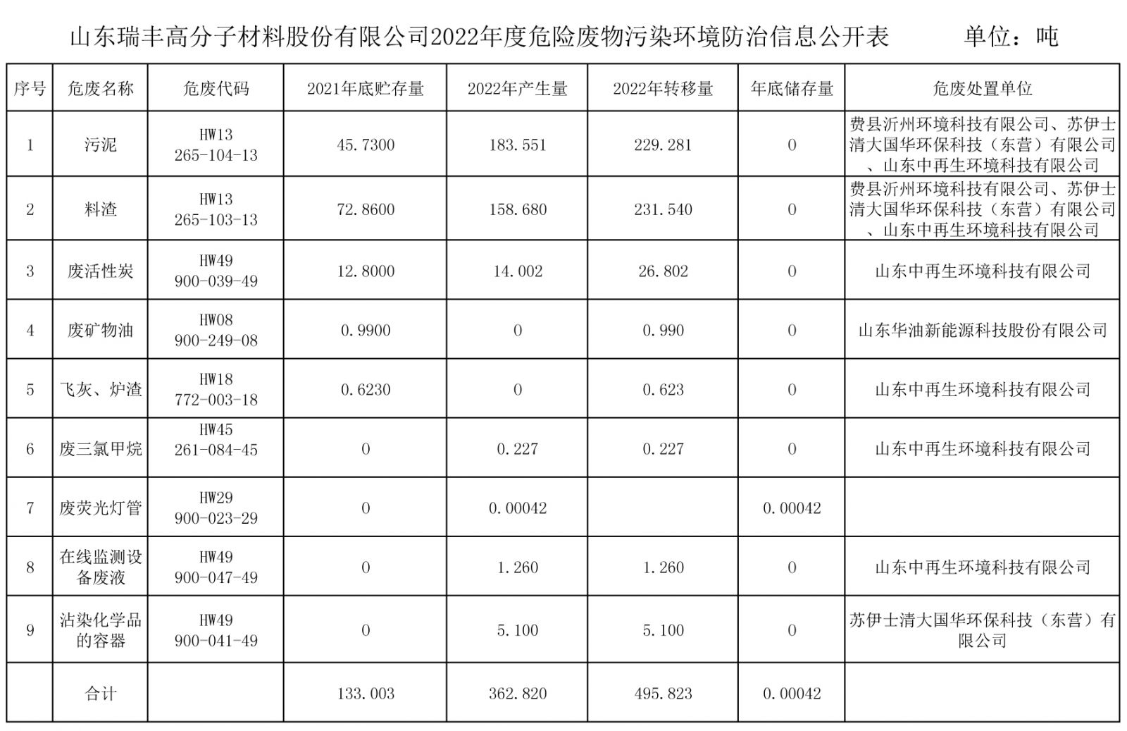 2022年度危險(xiǎn)廢物污染環(huán)境防治信息公開(kāi)表