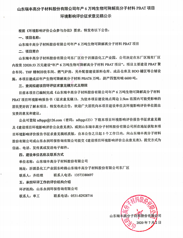 山東瑞豐高分子材料股份有限公司年產(chǎn)6萬噸生物可降解高分子材料PBAT項目環(huán)境影響評價征求意見稿公示